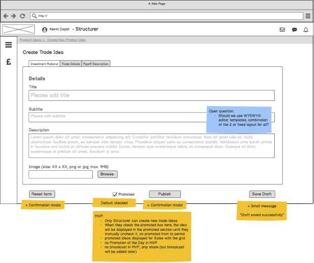 Designers created wireframes with Balsamiq based on the requirements. Analysts reviewed these wireframes and provided feedback. Iterations until the analysts felt that the wireframes meet the requirements.